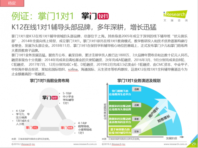 2月20日,知名第三方数据机构——艾瑞咨询发布《2018中国在线教育行业发展研究报告》,对中国在线教育领域进行了全面的梳理和分析。值得注意的是,掌门1对1作为K12在线1对1领域唯一被报告深度解读的教育机构,头部领先地位获认可。